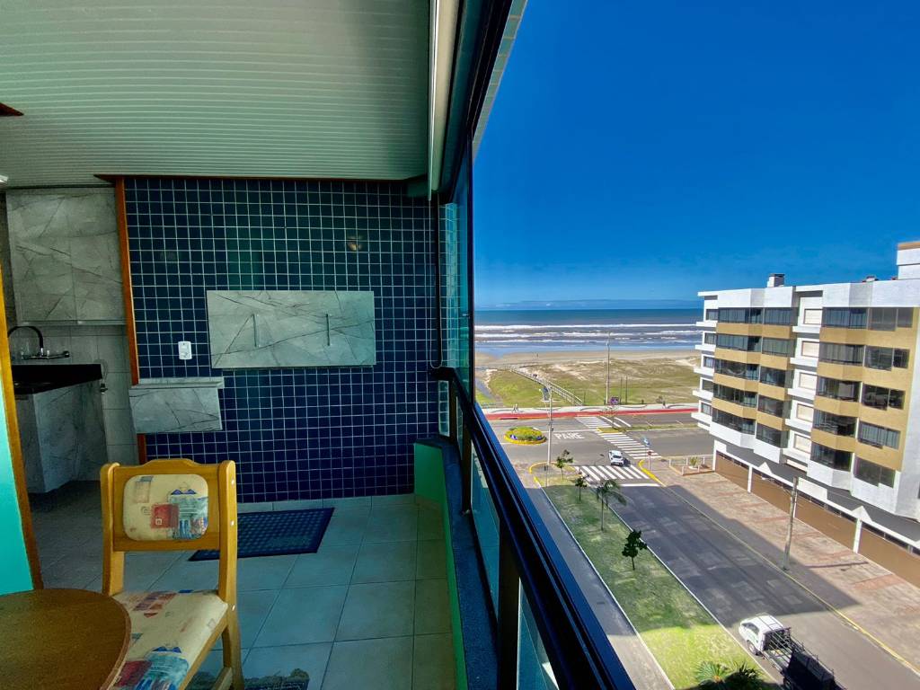 SACADA DE FRENTE COM VISTA MAR. Apartamento de 1 dormitório, banho social, estar e jantar, sacada, cozinha, área de serviços, churrasqueira, box de garagem, prédio a meia quadra do mar no centro da cidade.