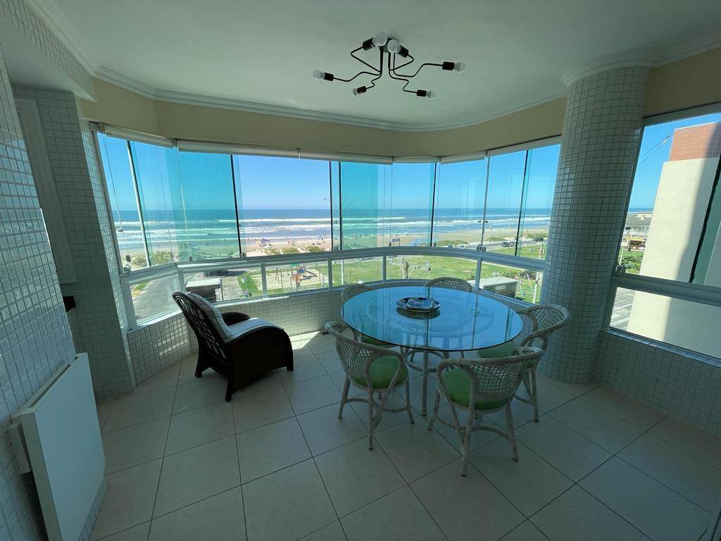 Excelente apartamento a Beira Mar de Capão da Canoa, com uma vista privilegiada para o mar e praça. Amplo apartamento distribuído em 3 dormitórios sendo 1 suíte, banheiro social, área de serviços separada, cozinha americana, sacada com churrasqueira, sala de jantar, sala de estar com lareira, todos ambientes mobiliados, vista panorâmica para praia, todas as peças bem iluminadas e ventiladas, box de estacionamento privativo com deposito.